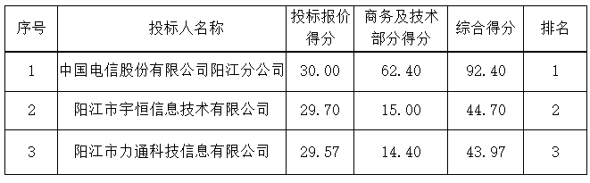 投標(biāo)結(jié)果:最終評(píng)標(biāo)委員會(huì)一致推薦中國電信股份有限公司陽江分公司為中標(biāo)單位,中標(biāo)金額為人民幣698850.00元,(大寫金額:陸拾玖萬捌仟捌佰伍拾元整)。