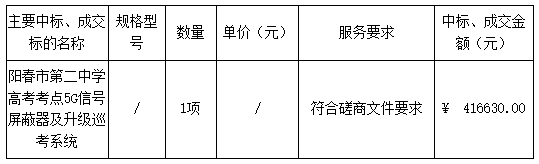 廣東業(yè)信采購招標有限公司受 陽春市第二中學 的委托,于2025年9月8日就 陽春市第二中學高考考點5G信號屏蔽器及升級巡考系統(tǒng)(項目編號:YXCG-20250812)采用競爭性磋商方式進行采購?,F(xiàn)就本次采購的成交結果公告如下: