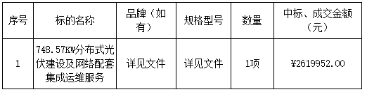 廣東業(yè)信招標有限公司受 陽江市睿明新能源有限公司 的委托,于2025年6月26日就 陽江市睿明新能源有限公司748.57KW分布式光伏建設項目 (項目編號:YXZB-20250620)采用公開比選方式進行采購?,F(xiàn)就本次采購的成交結果公告如下: