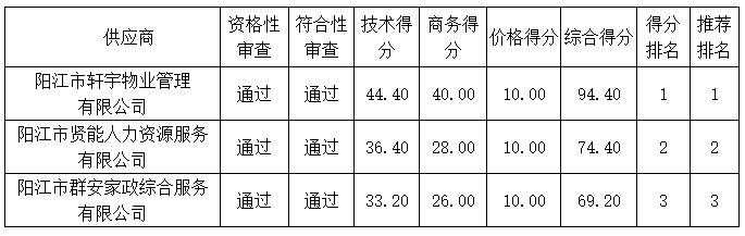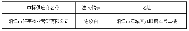 投標(biāo)結(jié)果:最終評(píng)標(biāo)委員會(huì)一致推薦陽(yáng)江市軒宇物業(yè)管理有限公司為中標(biāo)單位,中標(biāo)金額為人民幣2137312.00元,(大寫金額:貳佰壹拾叁萬(wàn)柒仟叁佰壹拾貳元整)。