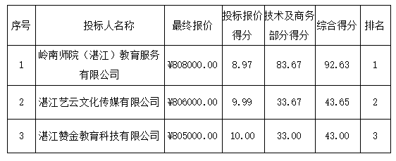 磋商結(jié)果:最終磋商小組一致推薦 嶺南師院(湛江)教育服務(wù)有限公司 為成交單位,成交金額為人民幣 808000.00元,(大寫金額:捌拾萬零捌仟元整 )。