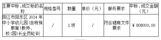 廣東業(yè)信采購(gòu)招標(biāo)有限公司受 陽江市陽東區(qū)教師發(fā)展中心 的委托,于2024年9月29日就 陽江市陽東區(qū)2024年中小學(xué)幼兒園(含特殊教育)教師、校(園)長(zhǎng)全員輪訓(xùn)項(xiàng)目(項(xiàng)目編號(hào):YXCG-20240914)采用競(jìng)爭(zhēng)性磋商方式進(jìn)行采購(gòu)?,F(xiàn)就本次采購(gòu)的成交結(jié)果公告如下: