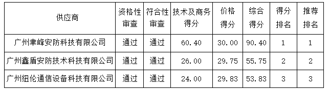 投標結(jié)果:最終評標委員會一致推薦 廣州聿峰安防科技有限公司 為中標單位,中標金額為人民幣 538400.00 元,(大寫金額: 伍拾叁萬捌仟肆佰元整 )。