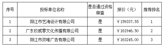 報價結果:最終詢價小組一致推薦 陽江市藝海設計有限公司 為成交單位,成交金額為人民幣 159337.55 元(大寫金額: 壹拾伍萬玖仟叁佰叁拾柒元伍角伍分 )。