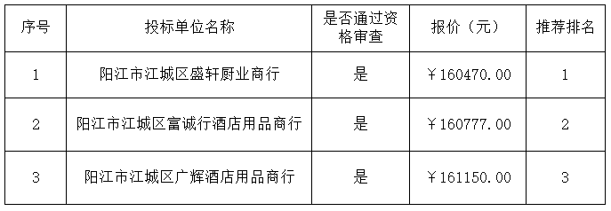 報價結果:最終詢價小組一致推薦陽江市江城區(qū)盛軒廚業(yè)商行為成交單位,成交金額為人民幣160470.00元(大寫金額:壹拾陸萬零肆佰柒拾元整)。