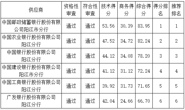 投標(biāo)結(jié)果:最終評(píng)標(biāo)委員會(huì)一致推薦中國(guó)郵政儲(chǔ)蓄銀行股份有限公司陽(yáng)江市分行為中標(biāo)單位。