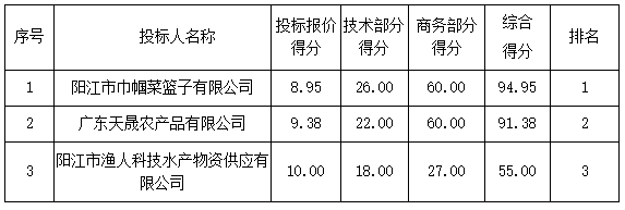 投標(biāo)結(jié)果:最終評標(biāo)委員會一致推薦 陽江市巾幗菜籃子有限公司 為中標(biāo)單位,中標(biāo)折扣率為 99.50% 。
