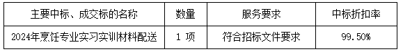 廣東業(yè)信采購招標(biāo)有限公司受 陽江技師學(xué)院 的委托,于2024年8月16日就 陽江技師學(xué)院2024年烹飪專業(yè)實習(xí)實訓(xùn)材料配送采購項目 (項目編號:YXCG-20240601)采用公開招標(biāo)方式進行采購?,F(xiàn)就本次采購的中標(biāo)結(jié)果公告如下: